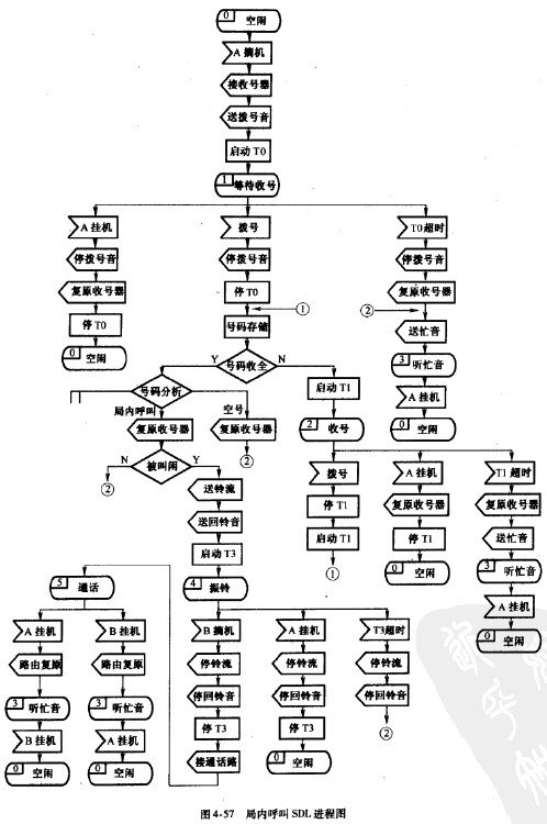 圖4-57給出的是使用SDL語言說明局內呼叫處理過程的一個例子,圖中共有6種狀態,在每個狀態下任一輸人信號均可引起狀態轉移。