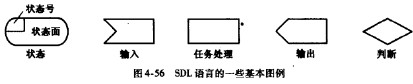 因此,實際中的呼叫處理過程是-系列復雜過程,涉及所有可能狀態,關系到所有可能出現的變化因素。采用SDL語言來全面描述呼叫處理過程是十分合適的,前面已經簡要介紹了SDL語言概況,這里我們用SDIVGR直觀繪制出狀態轉移圖,對于理觶軟件的功能以及研究控制過程都很有用。首先給出SDL語言的一些基本圖形符號如圖4-56所示。