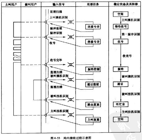 圖4-55給出了一個局內呼叫處理過程示意圖,整個呼叫接續過程可分為若干個階段,每一階段可以用穩定狀態來標志,如空閑、收號、振鈴、通話和聽忙音等。兩個穩定狀態之間由執行的各種處理連接。例如,從“空閑”狀態轉移到“等待收號”狀態,它們之間由主叫摘機識別、收號器接續、後號音接續等各種處理來連接。又如,從“振鈴”狀態轉移到“通話”狀態,它們之間由被叫摘機識別、停止振鈴、停回鈴音、路由驅動等處理來連接。