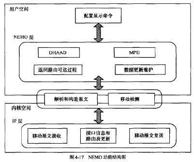 和MIPv6類似,移動子網的設計也可以分為用戶空間設計和內核空間設計。用戶空間實現了NEMO協議,負賁綁定、移動頭部處理、移動檢測等。對于MR、HA、CN,可將它們的功能整合在一起,通過類型變量控制不同的模塊啟動,實現不同的功能實體。內核空間分成兩部分:底層內核、IP層,為了保持與操作網絡協議棧的一致性,我們充分利用Linux中已有的數據結構和實現方法,來保證NEMO層對于傳輸層的透明性。底層內核提供系統管理、進程調度符理和系統調用:IP層提供數據包的發送和接收、隧道的建立等;具體模塊劃分見圖4-17。