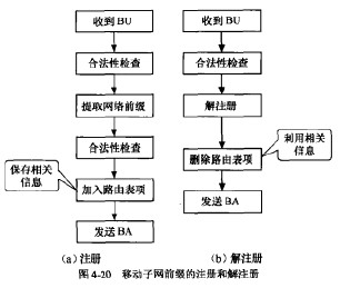 移動子網前綴的注冊和解注冊主要是MR將自身攜帶M絡的前綴通告給HA,保證移動過程中移動網絡內部的路由可達性移動子網前綴信息由BU攜帶,到達HA時更新其路由表。實現過程如圖4-20所示。