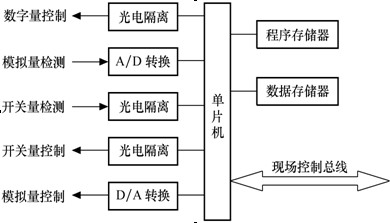 對(duì)動(dòng)力設(shè)備而言,其監(jiān)控量有數(shù)字量、模擬量、開(kāi)關(guān)量。數(shù)字量(如頻率、周期、相位、計(jì)數(shù))的采集,其輸入較簡(jiǎn)單,數(shù)字脈沖可直接作為計(jì)數(shù)輸入、測(cè)試輸入、I/O口輸入或作中斷源輸入進(jìn)行事件計(jì)數(shù)、定時(shí)計(jì)數(shù),實(shí)現(xiàn)脈沖的頻率、周期、相位及計(jì)數(shù)測(cè)量。對(duì)于模擬量的采集,則應(yīng)通過(guò)A/D變換后送入總線,I/O或擴(kuò)展I/O。對(duì)于開(kāi)關(guān)量的采集則一般通過(guò)I/O或擴(kuò)展I/O。對(duì)于模擬量的控制,須通過(guò)D/A變換后送入相應(yīng)控制設(shè)備。