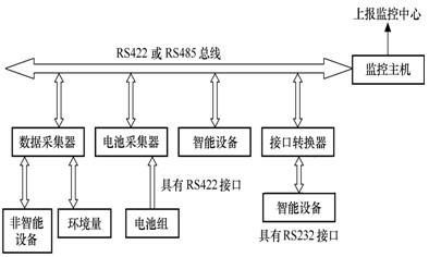 動(dòng)力監(jiān)控現(xiàn)場(chǎng)總線一般都采用RS422或RS485方式。各種高低配實(shí)時(shí)數(shù)據(jù)和環(huán)境量通過(guò)數(shù)據(jù)采集器,電池信號(hào)通過(guò)采集器接入現(xiàn)場(chǎng)控制總線送到端局監(jiān)控主機(jī),然后上報(bào)中心。