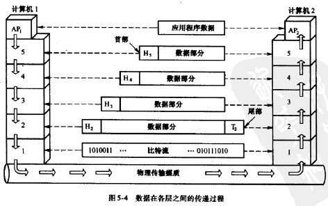 圖5-4所示說明主機的應用進程的數據在各層之間的傳遞過程中所經歷的變化。這里為簡單起見,假定兩個主機是直接相連的。假定計算機1的應用進程AP,向計算機2的應用進程AP2傳送數據。AP,先將其數據交給第5層。第5層加上必要的控制信息H5變成這一層的協議數據單元(ProtocolDataUnit,PDU),記為PDU-5,交給下一層。第4層收到這些數據單元后,加上本層的控制信息H,,形成PDU-4,再交給第3層。依次類推。不過到了第2層(數據鏈路層)后,控制信息分成兩部分,分別加到本層數據單元的首部(札)和尾部(T2),形成PDU-2(幀),交給第1層通過物理信道以比特流的形式傳輸到對方。