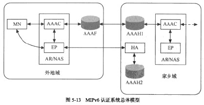 本方案需對MlPv6中的接入路由器(AR)的功能進行擴展。AR同時作為網絡接入服務器,由AAA客戶端(AAAC)及增強節點(EP)兩部分組成。MN需要兩個標識,一個作為接入服務的標識,另一個作為MIPv6服務的標識,都采用NAI格式(如user^realmXAAAF和AAAH1分別作為MN接入服務的外地AAA服務器和家鄉AAA服務器。MN的MIPv6服務認證服務器是AAAH2,由于MN的MIPv6服務由家鄉代理(HA)提供,MN的MIPv6認證信息必須在家鄉網絡進行認證,所以本方案只在MN的家鄉網絡部署認證MIPv6服務的AAA服務器。總體模型如圖5-13所示。
