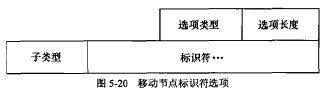 移動(dòng)節(jié)點(diǎn)標(biāo)識(shí)符選項(xiàng)是移動(dòng)IPv6消息移動(dòng)頭中新的可選數(shù)據(jù)字段。移動(dòng)節(jié)點(diǎn)可以用各種格式的標(biāo)識(shí)符。格式如圖5-20所示。本節(jié)中MN用該選項(xiàng)在移動(dòng)性消息中標(biāo)識(shí)自身。