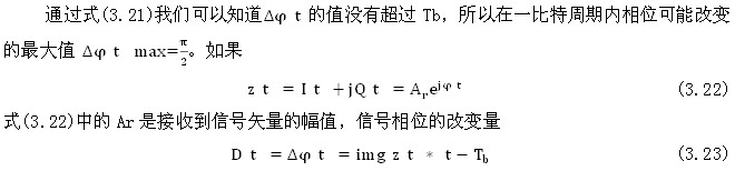 在接收端,調(diào)制后的GMSK信號經(jīng)過數(shù)字下變頻后恢復(fù)成I、Q兩路信號后,可以運(yùn)用一比特差分檢測進(jìn)行解調(diào)。根據(jù)1比特差分檢測算法找出在一比特周期內(nèi)接收到的信號在相位方面的改變量。這種相位方面的改變量可以用式(3.21)表示。