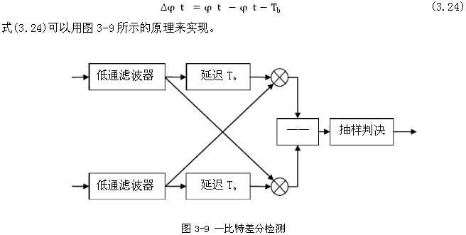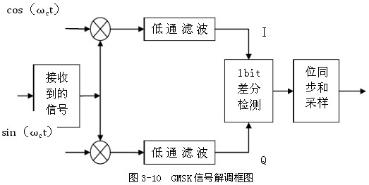當(dāng)△φ t 的值大于或等于零時,接收到的數(shù)據(jù)是“1”;當(dāng)△φ t 的值小于零時,接收到的數(shù)據(jù)是“0”。采用一比特差分檢測算法的GMSK信號解調(diào)框圖如圖3-10所示。