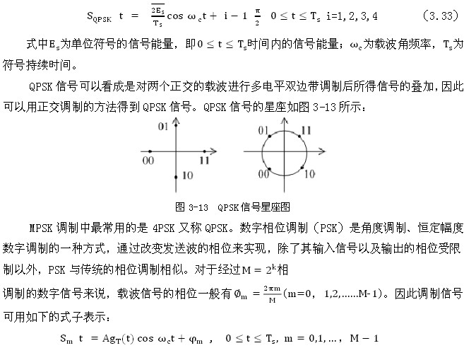 其中當(dāng)M=4時(shí)就是本文要討論的4PSK(QPSK),QPSK的載波相位有四種取值,每種取值代表兩比特的信號。隨著信號的改變,幅度恒定的載波信號的相位在四種取值間跳變。這四個(gè)相位的取值為間隔相等的值,比如,0,π2 ,π,3π2 ,每一個(gè)相位值對應(yīng)于一對消息比特。有一種變形,稱為π4 -QPSK是通過在每一個(gè)符號間隔的載波相位中引入附加的π4 相移來使符號同步變得容易些。