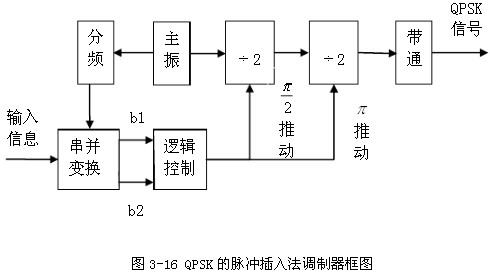 另一種調制方法是脈沖插入法,如圖3-16所示。頻率為4倍載頻的定時信號,經兩級二分頻輸出。輸入信息經串-并變換邏輯控制電路,產生π2 推動脈沖和π推動脈沖,在π2 推動脈沖作用下第一級二分頻多分頻一次,相當分頻鏈輸出提前π2 相位,在π推動脈沖作用下第二級二分頻多分頻一次,相當于提前π相位。因此可以用控制兩種推動脈沖的辦法得到不同相位的載波。顯然,分頻鏈輸出也是矩形脈沖,需經帶通濾波才能得到以正弦波作載頻的QPSK信號。