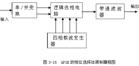 MPSK也可以采用其他方法實現調制。圖3-15中給出QPSK的相位選擇法調制器。在這種調制器中,載波發生器產生四種相位的載波,經邏輯選擇電路,根據輸入信息,每次選擇其中一種作為輸出,然后經帶通濾波器濾除高頻分量。顯然這種方法比較適用于載頻較高的場合,此時,帶通濾波器可以做得很簡單。