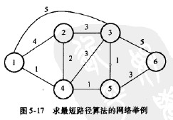 下面以圖5-17所示的網絡為例來討論這種算法,即尋找從源節點到網絡中其他各節點的最短路徑。為方便起見,設源節點為節點1。然后一步一步地尋找,每次找一個節點到源節點的最短路徑,直到把所有的節點都找到為止。
