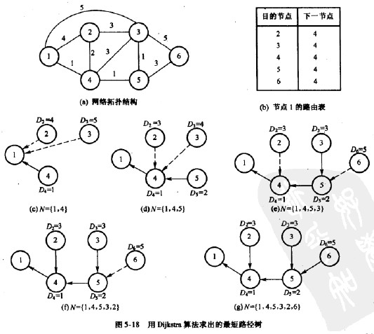 圖5-18給出了Dijkatra算法迭代求解步驟的詳細圖解。可以看出,上述的步驟②共執行了5次。第一次迭代找出節點1通過鏈路(1,4)到達節點4的距離最小,如圖5-18(c)所示。第二次迭代找出下一個最近的節點是5,如圖5-18(d)所示。第三次迭代找出下一個最近節點3,如圖5-18(e)所示。第四次迭代找出下一個最近節點2,如圖5-18(f)所示。最后一次迭代找出最后一個最近節點6,如圖5-18(g)所示。至此,所有節點都包含到網絡節點集合況中,計算過程即告結束。最后就得出以節點1為根的最短路徑樹,如圖18(g)所示,于是很容易生成如圖5-18(b)所示的節點1的路由表。從最短路徑樹可淸楚地看出從源節點(節點1)到網內任何一個節點的最短通路。此路由表指出對于發往某個目的節點的分組,從節點1發出后的下一節點應當是賽個節點。當然,像這樣的路由表,在所有其他各節點中都應當有一個。但這就需要分別以這些節點為源節點,重新執行算法,然后才能找出對應的最短路徑樹以及相應的路由表。