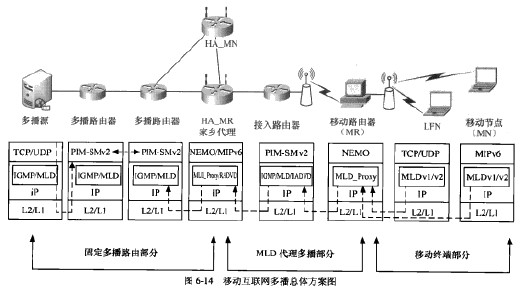 移動(dòng)多播方案的總體框圖如圖6-14所示,其中涉及多播源、多播路山器、家鄉(xiāng)代理、移動(dòng)終端(包含移動(dòng)節(jié)點(diǎn)和移動(dòng)路由器)、接入路由器等實(shí)體。每個(gè)實(shí)體上運(yùn)行不同的協(xié)議,共同實(shí)現(xiàn)移動(dòng)多播功能。多播路由器上支持基于IPv6的PIM-SMv2協(xié)議和MLDvl/MLDv2協(xié)議, 運(yùn)行PIM-SM程序:家鄉(xiāng)代理上支持MIPv6、NEMO等移動(dòng)性支持協(xié)議,并運(yùn)行MLD代理程 序;接入路由器由支持移動(dòng)終端的無線接入,支持DHCP和地址的自動(dòng)配置,運(yùn)行RADVD程 序:移動(dòng)終端上支持與家鄉(xiāng)代理對(duì)應(yīng)的移動(dòng)性支持協(xié)議,并且運(yùn)行發(fā)送MLDvl及MLDv2消息的終端程序,若移動(dòng)終端為移動(dòng)路由器,則還要實(shí)現(xiàn)MLD代理的功能,以實(shí)現(xiàn)為移動(dòng)子網(wǎng)中 的本地固定節(jié)點(diǎn)(LFN)和移動(dòng)節(jié)點(diǎn)(MN)提供多播服務(wù)。