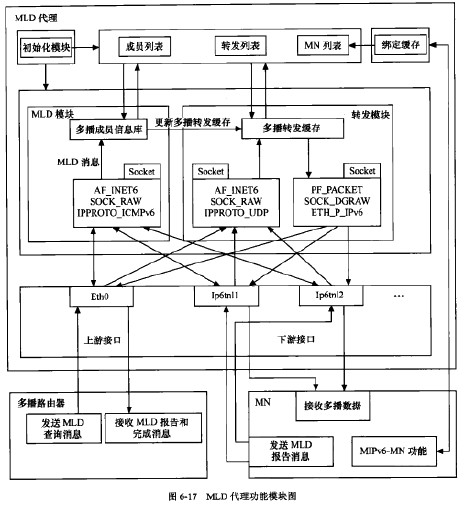其次,從內(nèi)核獲取MLD消息之后,利用MLD模塊生成組成員列表:同時,通過更新多播轉(zhuǎn)發(fā)緩存來生成轉(zhuǎn)發(fā)列表:通過綁定緩存獲取MN的信息,從而生成MN列表。
