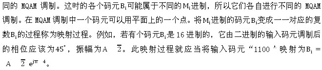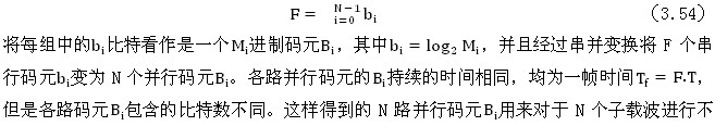式(3.52)和式(3.53)非常相似。若暫時(shí)不考慮兩式常數(shù)因子的差異以及求和項(xiàng)數(shù)(K和N)的不同,則可以將式(3.51)中的K個(gè)離散值S n 當(dāng)作是K路OFDM信號(hào)。下面就來討論如何具體解決這個(gè)計(jì)算問題。 設(shè)OFDM系統(tǒng)的輸入信號(hào)為串行二進(jìn)制碼元,其碼元持續(xù)時(shí)間為T,先將此輸入碼元序列分成幀,每幀中有F個(gè)碼元,即有F比特。然后將此F比特分成N組,每組中的比特?cái)?shù)可以不同。設(shè)第i組中包含的比特?cái)?shù)為bi,則有