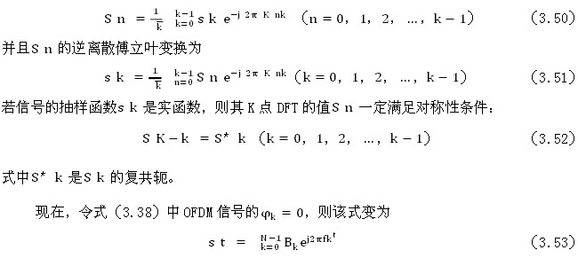 OFDM信號(hào)表示式(3.38)的形式如同逆離散傅立葉變換(IDFT)式,所以可以用計(jì)算IDFT和DFT的方法進(jìn)行OFDM調(diào)制和解調(diào)。下面首先來復(fù)習(xí)一下DFT公式。 設(shè)一個(gè)時(shí)間信號(hào)s t 的抽樣函數(shù)為s k ,其中k=0,1,2,…,k-1,則s k 的離散傅立葉變換(DFT)定義為