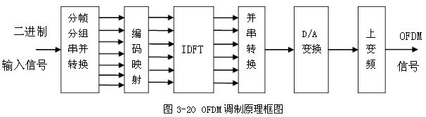 按照上述原理畫出的OFDM調(diào)制原理方框圖如圖3-20所示。在接收端OFDM型號(hào)的解調(diào)過程是其調(diào)制的逆調(diào)制的逆過程,這里不再闡述。