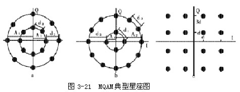 MQAM信號星座圖有圓形星座圖、不均勻圓形星座圖和矩形星座圖三大類型。圖3-21示出了16QAM(M=4)以上三種類型的星座圖。