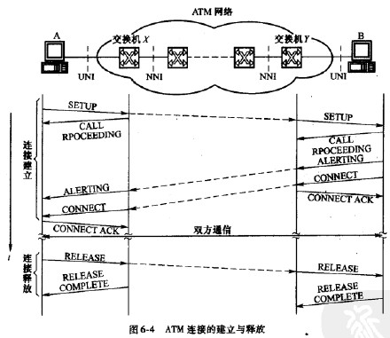 主叫用戶終端A使用UNI信令SETUP向與其相鄰的ATM交換機X發起呼叫連接請求,設被叫用戶終端是B。交換機X收到SETUP后,一邊向端點A發送CALLPROCEEDING,表示已收到該呼叫;一邊發送相應的NNI信令給下一個節點。該NNI信令經過網絡內部多個節點的轉發,一直到達與終端B相鄰的交換機Y。交換機Y接著向B發送SETUP消息,表示有一個呼叫到來。被叫終端B收到SETUP后,向交換機Y回應CALLPROCEEDING消息(可選),表示連接建立請求正在進行處理。處理完畢后,如果可以接受呼叫,終端B就發出ALERTING消息,表示已開始提醒被叫用戶(例如給用戶振鈴)。交換機Y用相應的NNI信令將ALERTING消息轉發到主叫側。在被叫用戶接受呼叫(例如摘機)時,終端B向網絡發出CONNECT消息,交換機Y一邊將該消息轉發到主叫側,一邊向終端B回應CONNECTACK消息,以示確認。主叫終端A收到CONNECT消息后,也可回應一個CONNECTAGK消息。至此就完成了一條選輯連接的建立過程。
