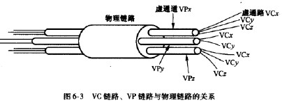 ATM的虛電路分為兩個級別,它們是:虛通道(VirtualPath,VP)和虛通路(VirtualChannel,VC)。相應的邏輯連接分別稱為虛通道連接VPC和虛通路連接VCC。一個端到端的連接一般由若干段串接而成,其中每一段稱為鏈路。因此,相應的有VP鏈路和VC鏈路,它們分別用VPI和VPI+VCI標識。這里需要強調指出的是,VPI和VCI不是端到端虛通道和虛通路的標識符,而是VP鏈路和VC鏈路的標識符;一個端到端邏輯連接的各段邏輯鏈路的標識符一般是不相同的,換句話說,VPI和VCI只具有局部意義。VC鏈路、VP鏈路與物理鏈路的關系如閣6-3所示。一條物理鏈路包含多條VP(鏈路),每一VP(鏈路)又包含許多VC(鏈路)。VPI相同,VCI不同,標識不同的VC;VPI不同,VCI相同,也代表不同的VC。所以要用VPl+VCI作為VC(鏈路)的標識符。