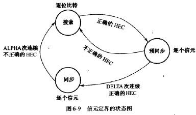 一旦搜尋到正確的HEC,系統(tǒng)就轉(zhuǎn)到預(yù)同步(PRESYNC)狀態(tài)。在預(yù)同步狀態(tài)還要逐個信元核對HEC,當連續(xù)收到DELTA個含有正確HEC的信元時,才轉(zhuǎn)到同步(SYNC)狀態(tài)。在同步狀態(tài),仍然是逐個信元進行HEC檢査(糾錯與檢錯結(jié)合),如發(fā)現(xiàn)連續(xù)ALPHA個信元中的HEC有錯時,就認為丟失了同步,又轉(zhuǎn)人搜索狀態(tài)。當物理層采用基于SDH的接口時,建議的ALPHA值為7,DELTA值為6;當物理層采用基于純信元的接口時,建議的ALPHA值為7,DELTA值為8。采用這樣嚴格的信元同步算法的目的是為了使假同步和假失步的概率都非常小。