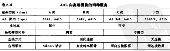 ITU-T規定了四種類型(type)的AAL,以支持上述的四類服務。這四種AAL分別是 AAL1, AAL2, AAL3/4和AAL5。表6-4示出與這四種服務類別對應的屬性及AAL類型。請注意:區分服務的是“類別(class)”,區分AAL的是“類型(type)”。