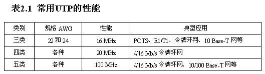 雙絞線主要分成兩類:非屏蔽(UTP:Unshielded Twisted Pair)和屏蔽(STP:Shielded Twisted Pair )。屏蔽雙絞線雖然傳輸特性優于非屏蔽雙絞線,但價格昂貴,操作復雜,除了應用在IBM的令牌環網中以外,其他領域并無太多應用。目前電話用戶線和局域網中都使用非屏蔽雙絞線,例如普通電話線多采用24號UTP。常用UTP的性能如表2.1所示。