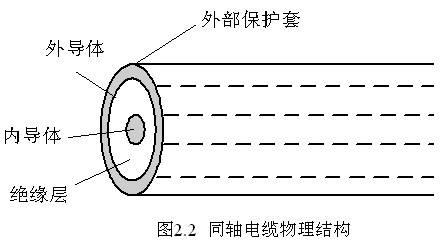 同軸電纜是貝爾實驗室于1934年發明的,最初用于電視信號的傳輸,它由內、外導體和中間的絕緣層組成,內導體是比雙絞線更粗的銅導線,外導體外部還有一層護套,它們組成一種同軸結構,因而稱為同軸電纜,其物理結構如圖2.2所示。