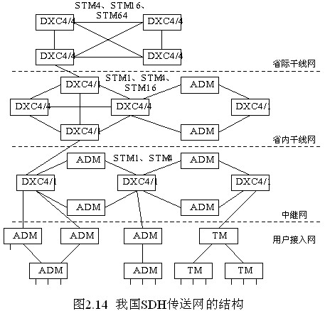 按地理區(qū)域來分割,現(xiàn)階段我國SDH傳送網(wǎng)分為四個(gè)層面:省際干線網(wǎng)、省內(nèi)干線網(wǎng)、中繼網(wǎng)、用戶接入網(wǎng),如圖2.14所示。
