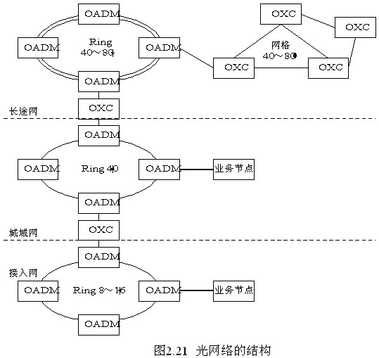 圖2.21描述了一個三級OTN結構。在長途核心網絡中,為保證高可靠性和實施靈活的帶寬管理,通常物理上采用網孔結構,在網絡恢復策略上可以采用基于OADM的共享保護環方式,也可以采用基于OXC的網格恢復結構。在城域網中和接入網中則主要采用環形結構。
