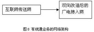 “有線通”業(yè)務通過整合中國移動的光纖城域網(wǎng)以及廣電的cable接入網(wǎng),為用戶提供寬帶接入服務,較之VoIP更進一步,不僅實現(xiàn)了網(wǎng)絡的交叉互聯(lián),也積極嘗試了電信互聯(lián)網(wǎng)運營商與廣電運營商在網(wǎng)絡層面的合作,有線通業(yè)務的網(wǎng)絡架構如圖8所示。“有線通”業(yè)務由中國移動與各地廣電運營商合作開展,這種合作模式在三網(wǎng)融合方面走在最前面的上海已經(jīng)很成熟,目前已經(jīng)積累了55萬用戶,在揚州、無錫、蘇州、泉州、福州等城市也廣泛推廣。