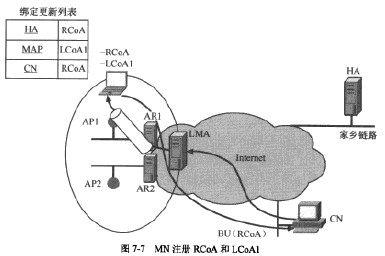 在HMIPv6中MN發(fā)生兩種注冊(cè),即向HA注冊(cè)RCoA(Regional Care-of Address)和HoA、向MAP注冊(cè)RCoA和LCoA(Local Carc of Address)。如圖7-7所示,RCoA是由LMA(LocalMAP)分配的,LCoAl是由接入路由器ARI分配的。