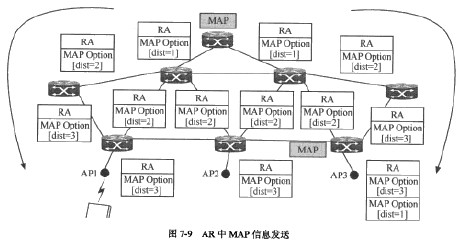 在一個(gè)網(wǎng)絡(luò)中,可能有多個(gè)MAP、多個(gè)AR,它們的管理區(qū)域是通過動(dòng)態(tài)MAP發(fā)現(xiàn)(DynamicMAPDiscovery)劃分的。首先,MAP在自己的路由通告(RouterAdvertisement.RA)中攜帶自己的信息:全球IPv6地址和前綴、自己的優(yōu)先級(jí)、網(wǎng)絡(luò)距離(跳數(shù))。每個(gè)AR會(huì)將收到的MAP信息放入自己的RA中進(jìn)行發(fā)送,如圖7-9所示。AR會(huì)增加MAP信息中的網(wǎng)絡(luò)距離項(xiàng)。MN會(huì)根據(jù)自己的需要選擇MAP,運(yùn)動(dòng)得快,選擇遠(yuǎn)點(diǎn)的MAP:運(yùn)動(dòng)得慢,選擇近一些的MAP。