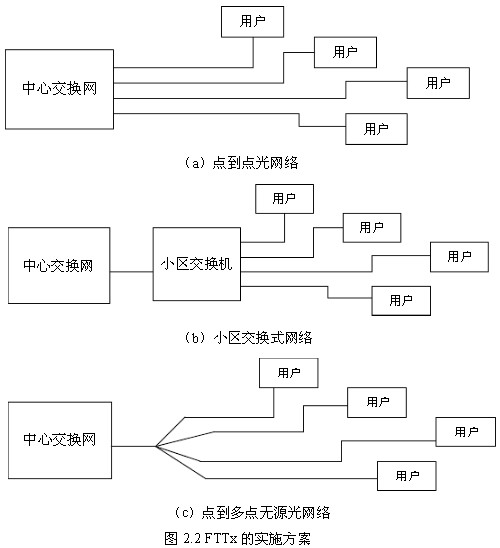 第三,不利于開展多播和組播業務。因此這種點到點的光纖接入方式在實際中應用并不多。圖2.2(b)是點到點接入方式的改進,中心局交換機和用戶交換機之間通過光纖連接,用戶交換機為每個用戶提供點到點的光纖接入,相對于圖2.2(a)中的點到點光纖接入,這種改進方式可以節約光纖資源。