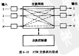 與電路交換機相似,ATM交換機也由內部交換網絡、輸人輸出接口和交換控制器三大部分組成。圖6-10示出這三大部分及它們之間的相互關系。交換網絡(Switching Fabric)是交換機的核心,其主要功能是中繼轉發(R),即實現信元從輸人端口到輸出端口的轉移。輸人輸出接口包括UNI和NN1兩種接口,要實現物理層和ATM層的功能。交換控制器主要完成信令適配層和信令高層的功能,包括信令的收發和處理,實現連接控制,包括即時的(Demand)呼叫連接控制和一直、半一直連接的控制。