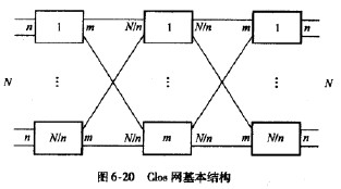 yvxyvcioe網(wǎng)絡的基本結構如圖6-20所示,yv為人線和出線數(shù)。第i級的交換單元(SE)為nxm,共有N/n個;第3級的交換單元為mxn,也有;V/n個;中間級交換單元為N/nxN/n,共有m個。這種3級Clos網(wǎng)絡可記為(N,n,m),顯然,在Clos網(wǎng)絡任何一對輸入端與輸出端之間有m條可供選擇的路徑,每一條路徑通過不同的中間級交換單元,因而Clos網(wǎng)屬于多路徑網(wǎng)絡。圖6-20doe網(wǎng)基本結構Clos網(wǎng)原先用于電路交換。如3.1.2節(jié)所述,對于圖6-20所示的Clos網(wǎng),其電路交換的內(nèi)部無阻塞條件是:m^2n-l0Clos網(wǎng)也可用于快速分組交換,所以用于ATM交換的3級Clo8網(wǎng),其結構仍如圖6-20所示,但每個SE的開關狀態(tài)是根據(jù)ATM信元的路由標簽而改變的。前已提及,對于多路徑的3級交換網(wǎng)絡,路由標簽不僅要指明第3級的輸出端口號,而且要指明所經(jīng)過的中間鏈路,即第1級的輸出端口號和第2級的輸出端口號。需要強調(diào)的是,信元的路由標簽決定于信元的輸人端口號和VPI/VCI值,因此屬于同一虛通路的信元在交換網(wǎng)絡內(nèi)部具有相同的路由,亦即屬于同一虛通路的各個信元通過交換網(wǎng)絡后仍然能夠保持它們的先后次序。