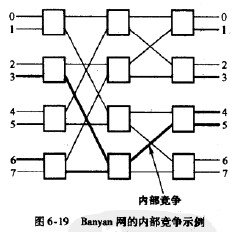 內(nèi)部競爭性:Banyan是具有內(nèi)部競爭的有阻塞網(wǎng)絡。考慮到各個輸人端與輸出端之間的單路徑并非完全分離,存在公共的內(nèi)部鏈路,則內(nèi)部競爭是不可避免的現(xiàn)象。在圖6-19中給出了示例:在同一時隙,輸人端3至輸出端5和輸人端6至輸出端4同時要傳送信元時,會在級間鏈路上產(chǎn)生沖突。而且這種沖突的概率隨著輸人業(yè)務量強度的增大而加大。