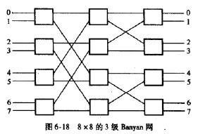 圖6-18示出W=8的由2x2SE構成的3級Banyan網(wǎng)。從圖可以看出,與基于開關矩陣型結構或全互連結構的Crossbar不同,Banyan網(wǎng)是基于樹型拓撲結構的。但每個SE卻是基于Crowbar的結構,2x2的SE也具有bar和cross兩種狀態(tài),每個輸人通過3級SE可以到達任何輸出。如果每個SE內(nèi)部具有緩沖器,稱為緩沖型Banyan網(wǎng),否則就稱為無緩沖型Banyan網(wǎng)。