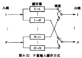 輸人緩存,又稱為輸人排隊,是在交換網絡的毎個輸人端設置信元緩存器,如圖6-21所示。