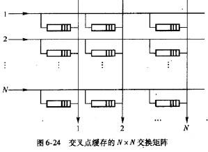 交叉點緩沖是在Crossbar結構中的每個交叉點設置緩存器,如閣6-24所示為具有交叉點緩存的NxN crossbar結構: