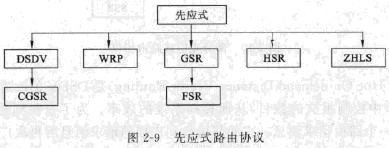 先應式路由協議又被稱為表驅動(table-driven)路由協議?是一種基于表格的路由協議。在這種路由協議中,每個節點維護一張或多張表格,這些表格包含到達網絡中其他所有節點的路由信息。當檢測到網絡拓撲結構發生變化時節點在網絡中發送更新消息。收到更新消息的節點更新自己的表格,以維護一致的、及時的、準確的路由信息。不同的先應式路由協議的區別在于拓撲更新消息在網絡中傳播的方式和需要存儲的表的類型。先應式路由協議不斷地檢測網絡拓撲和鏈路質量的變化,根據變化更新路由表,所以路由表可以準確地反映網絡的拓撲結構。源點一旦要發送報文,可以立即得到到達目的地的路由。圖2-9是現有的部分先應式路由協議。
