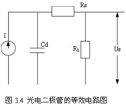 這個等效電路對于分析光電二極管的重要參數(shù)以及后續(xù)前置放大電路設(shè)計和選取十分重要??傮w來看,它功能類似一個帶寬為1/(2πR1Cd)低通濾波器,R1是負(fù)載阻抗,Cd是固有電容(約為1pF)。Rs是二極管的連續(xù)阻抗,通常Rs<R1。要增加帶寬,就應(yīng)該使R1和Cd最小。R1有不可能無限制的小,因為太小將會降低輸出電平,并增加熱噪聲的功率,減小節(jié)電容Cd可以通過減小結(jié)面積及增大勢壘厚度來實現(xiàn)。而增大勢壘厚度就會增加渡越時間,減小響應(yīng)時間。