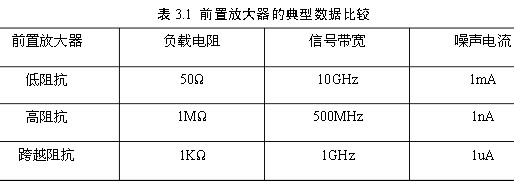 總之,幾種前置放大器各有自己的優(yōu)缺點(diǎn)。集成前置放大器主要缺點(diǎn)是,在數(shù)字系統(tǒng)中,如果有一系列的―1‖,那么集成塊建立起一個(gè)可以評估的DC分量時(shí),接收機(jī)將達(dá)到飽和,且集成前置放大器寬帶應(yīng)用要求等同化、動態(tài)范圍受限。表3.1給出了幾種前置放大器的典型數(shù)據(jù)比較。