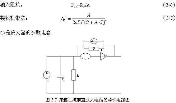 圖3.7是跨越阻抗的前置放大電路的等效電路圖,跨越阻抗前置放大器提供了高靈敏度/寬頻帶的特性,它的動態(tài)范圍較大。如圖所示,RF仍然很大,但是副反饋使輸入阻抗減小了A倍,帶寬相應(yīng)也比同阻抗的高阻抗放大器擴(kuò)大了A倍。有: