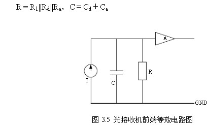 結(jié)合圖3.4光電二極管的等效電路,光接收機(jī)的前端可以等效為一個(gè)電路如圖3.5,光電二極管的信號由一個(gè)理想電流源I代表。該電流源3dB帶寬B=1/2πRC,其中: