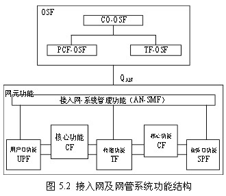 由于接入網中設備的特點與接入特性和傳輸技術密切相關,所以其網管系統中的運行系統功能實現可以分為4個部分:端口及核心功能運行、系統功能實體、傳送功能-運行系統功能實體、調度管理功能實體。它們的相互關系以及與接入網各功能實體的相互聯系如圖5.2所示。PCF-OSF對AN中UPF、SPF和CF進行管理,TF-OSF對AN中的TF進行管理,其功能和TF使用的具體技術有關。由于PCF-OSF和W-OSF是兩個獨立的管理功能,且與接入技術密切相關,它們的協調是通過CO-OSF來完成的。CO-OSF獨立于具體的接入技術,從全網的角度對接入網內不同功能實體間的相互關系或故障告警進行適當的調度和協調。例如,當接入網設備告警,W-OSF和PCE-OSF都不能單獨確定故障發生的位置時,就需要CO-OSF來進行進一步的分析和調度處理。