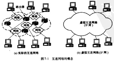 互聯網在網際層采用了標準化協議。圖7-1(a)表示有許多計算機網絡通過一些路由器進行互連。由于參加互連的計算機網絡都使用相同的網際協議(Internet Protocol,IP),因此可以將互連以后的計算機網絡看成如圖7-1(b)所示的一個虛擬互連網絡。所謂虛擬互連網絡也就是邏輯互連網絡,它的意思就是互連起來的各種物理網絡的異構性本來是客觀存在的,但是我們利用IP就可以使這些性能各異的網絡從用戶看起來好像是一個統一的網絡。這種使用IP的虛擬互連網絡可簡稱為IP網。使用虛擬互連網絡的好處是:當互聯網上的主機進行通信時,就好像在一個網絡上通信一樣,它們看不見互連的各具體的網絡的異構細節(如具體的編址方案、路由選擇協議等)。