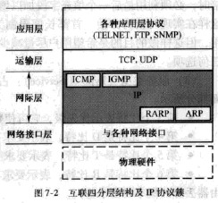 圖7-2出了這四個協議和網際協議(1P)的關系。在這一層中,ARP和RARP畫在最下面,因為IP經常要使用這兩個協議。ICMP和IGMP畫在這一層的上部,因為它們要使用IP。由于篇幅的原因,本章將只介紹與分組傳輸和交換密切相關的ARP/RARP,ICMP/IGMP請讀者參考相關文獻。