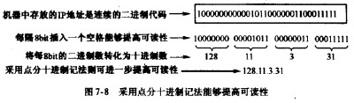 在主機或路由器中存放的P地址都是32bit的二進制代碼。為了提高可讀性,在寫出給人看的IP地址時,往往毎隔8bit插人一個空格。但這樣還是不方便,于是我們常常將32bit的IP地址中的每8bit用其等效的十進制數字表示,并且在這些數字之間加上一個點。這就叫做點分十進制記法(dotteddecimalnotation)。圖7-8表示了這種方法,這是一個B類1P地址。顯然,128.11.3.31比10000000000010110000001100011111讀起來要方便得多。